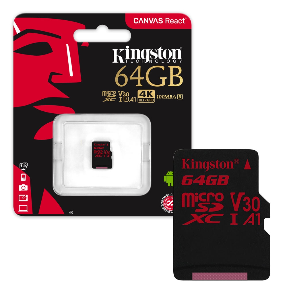 Kingston Canvas React MicroSDXC Memory Card 100MB/s UHS-1 U3 A1 V30 Class 10 – 64GB