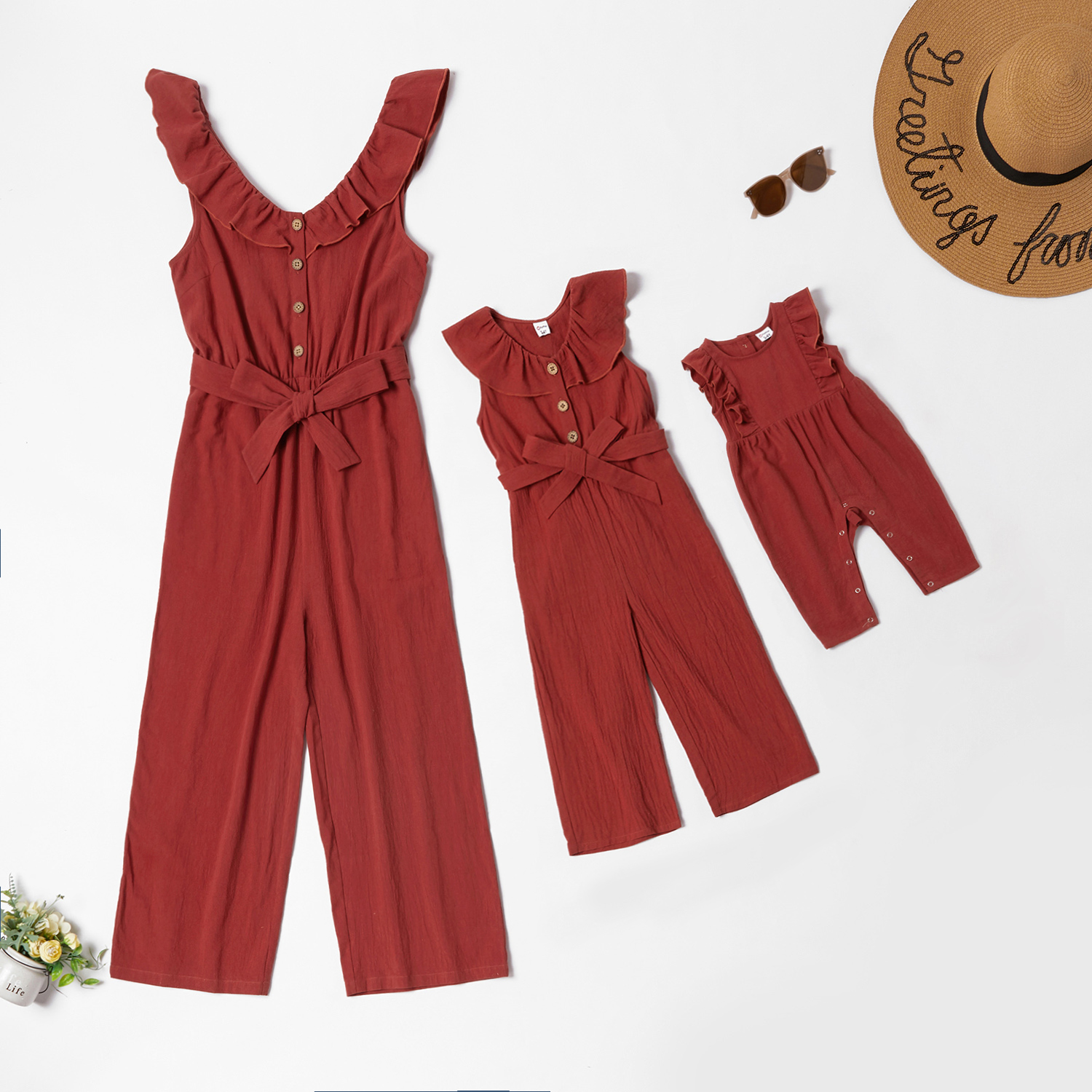 Mommy and Me 100% Cotton Flounce Decor V-neck Solid Jumpsuits