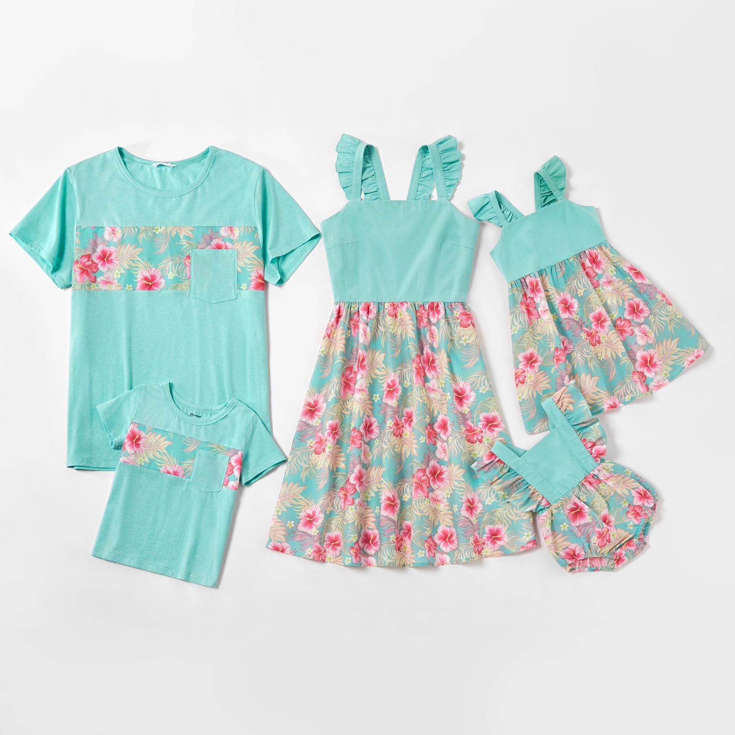 Mosaic Floral Flutter-sleeve Tank Dresses Color Block T-shirt for Dad-Mom-Boy-Girl-Baby
