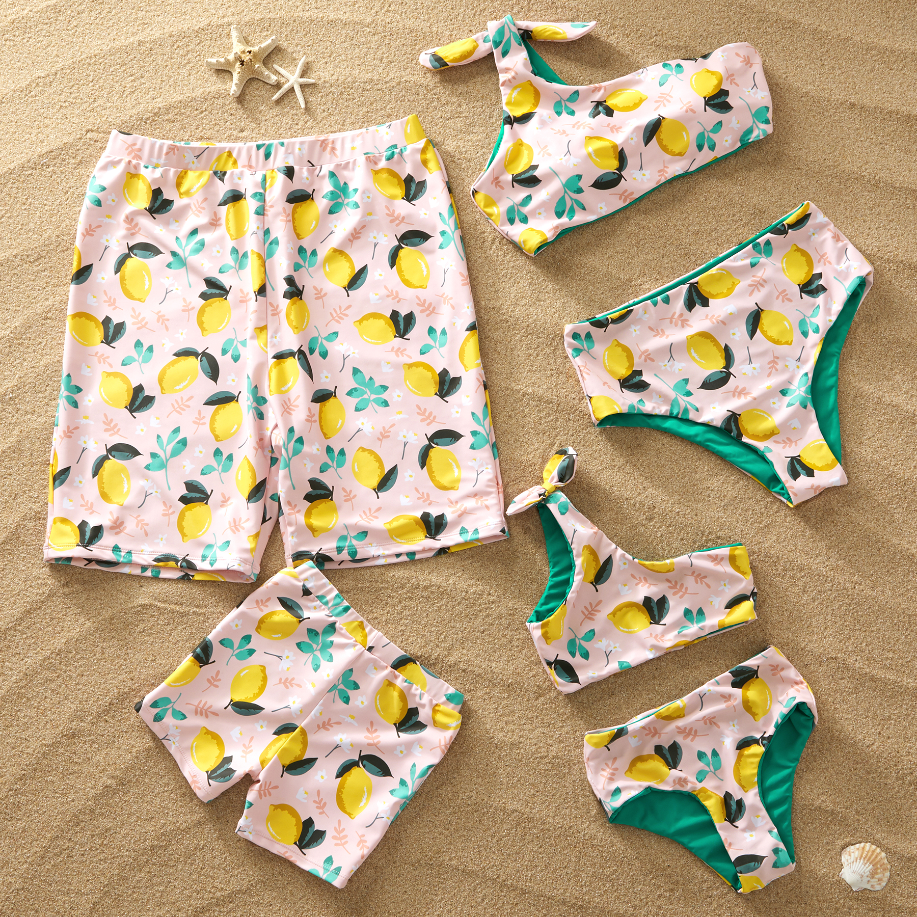 Reversible Lemon Print or Solid Green Family Swimsuits
